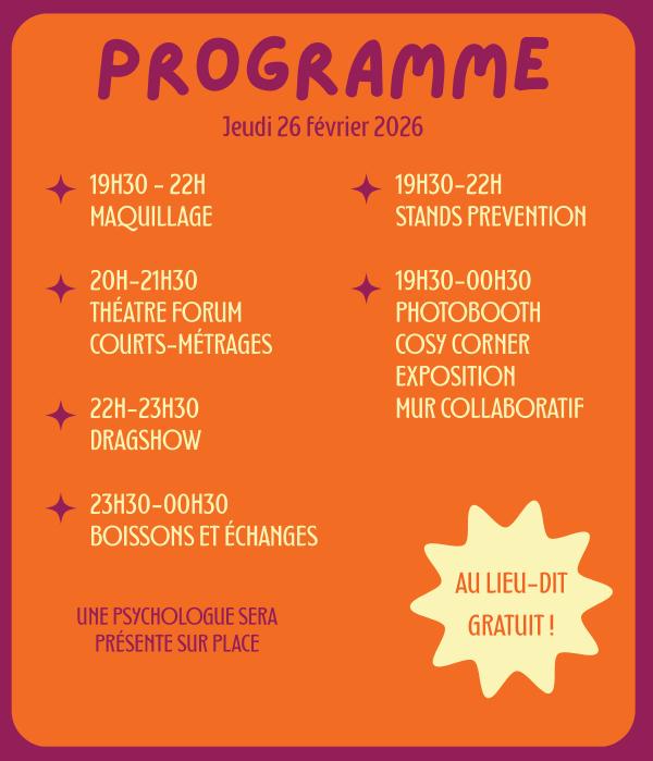 Au fil de la soirée, compose ton propre parcours : fais-toi maquiller, assiste à une pièce de théâtre, découvre un drag show, participe aux animations.